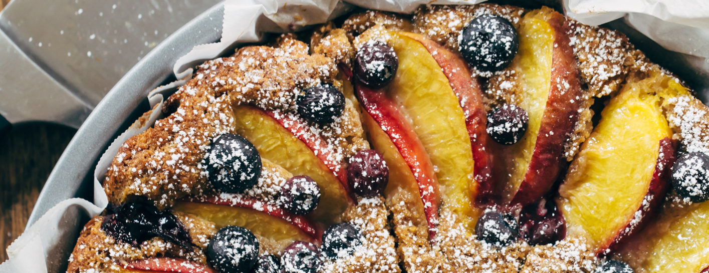 Arrange the peach slices in a circle on top of the batter. Arrange the blueberries over the top of the cake. Sprinkle the top with organic turbinado sugar or powdered sugar.