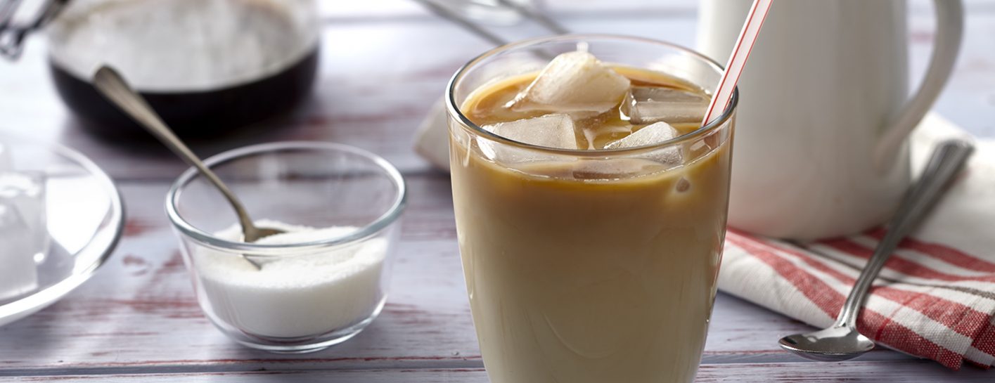 Fill two tall glasses halfway with ice. Divide coffee and “creamer” between glasses.
